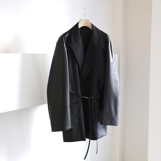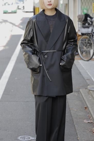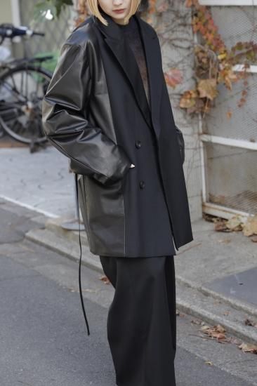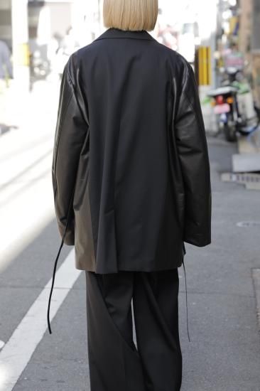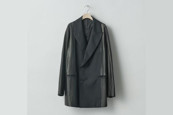 肩周りの落ち感が特徴的。 四面構成に設定し、身頃脇から袖にかけてレザーで仕上げた特別な一着。
