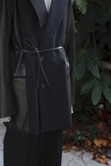 着丈をやや長めに設定している定番のロングジャケットをベースに、フロント重なり分を調整し、 ピークドラペルで仕上げたジャケット