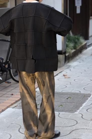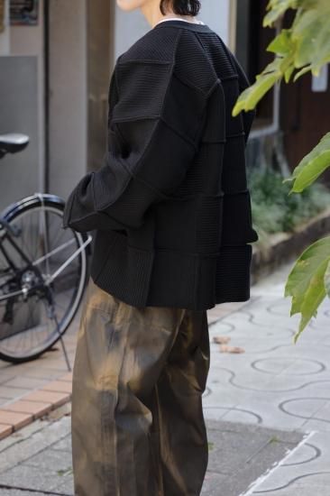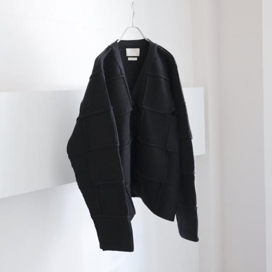 マルタン・バレの斜めのラインの組み合わせの作品からインスピレーションを得て、ニットの畦組織を横、縦、斜めの四角いパーツを作成し、そのパーツを全て繋ぎ合わせ作成、かなりの時間と手間のかかった今季を象徴する一押しのカーディガンです。