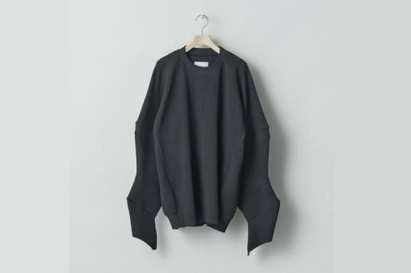袖部分を互い違いに大きさ、シルエットの異なるパーツを縫製し、独特なシルエットに仕上げた一着。編み出しで各パーツを成形しているため、縫い代のかさばりを抑えてすっきりとしたフィット感に。