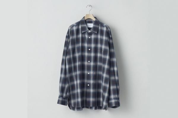 素材は、タテ糸に落ち感と光沢感のあるヴィスコース/リヨセルの混紡糸、ヨコ糸には綿糸を使用した交織 のオリジナルオンブレチェック。ヴィスコース/リヨセルの光沢があり落ち感のある表情を残しつ つ、ヨコ糸の綿糸でシルエットが残るバランスに設定。 仕上げにピーチ起毛をすることで、ソフトな風合いを表現した素材を使用しております。