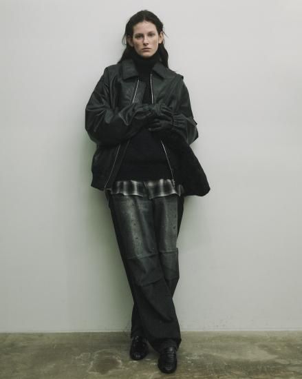 シルエットは身幅、アーム部分をたっぷりととったゆったりとしたシルエット。ただオーバーサイ ズなだけでなく、縦方向に落ち感の出るよう肩まわりの袖山のバランス、袖部分の生地のタック、首元のカラーの角度、サイドのスリットで上品で品あるバランスに整え作成されております。