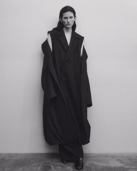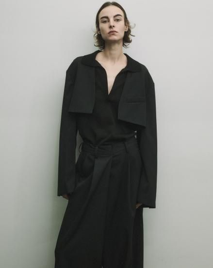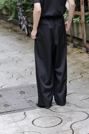 右脚フロント部分に深いタックをとったはかまのような見え方が特徴で、歩くと深くとったタック分が覗く。ウエスト部分はイージー仕様、左ウエスト部分にコンシールファスナーを配置。裾幅を広めに設定し迫力のあるシルエットに。