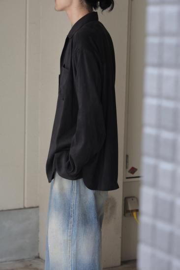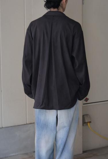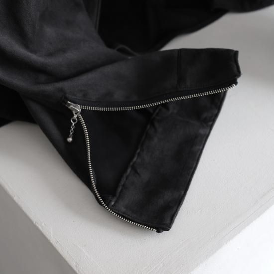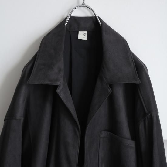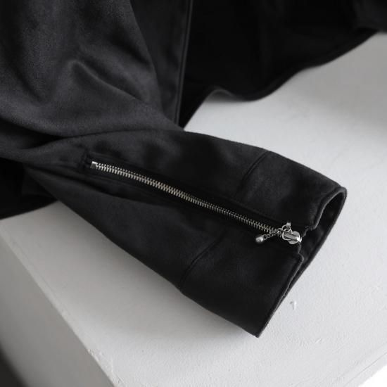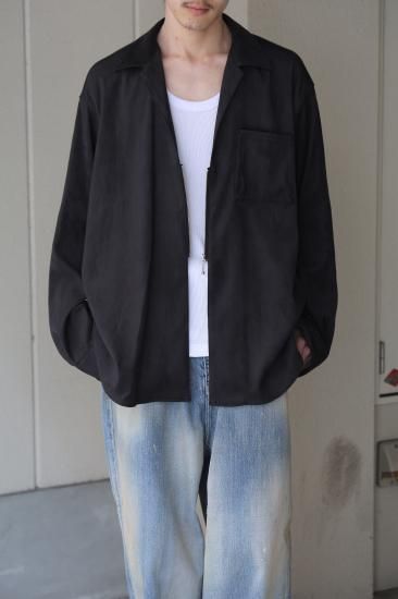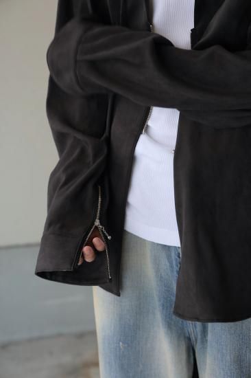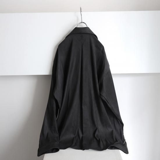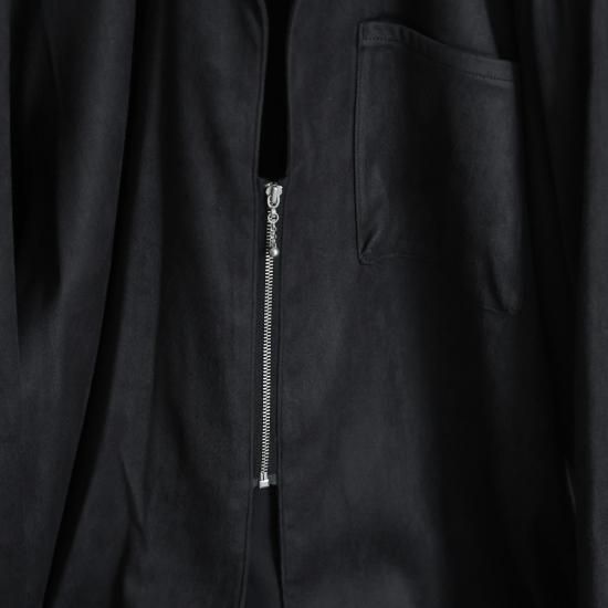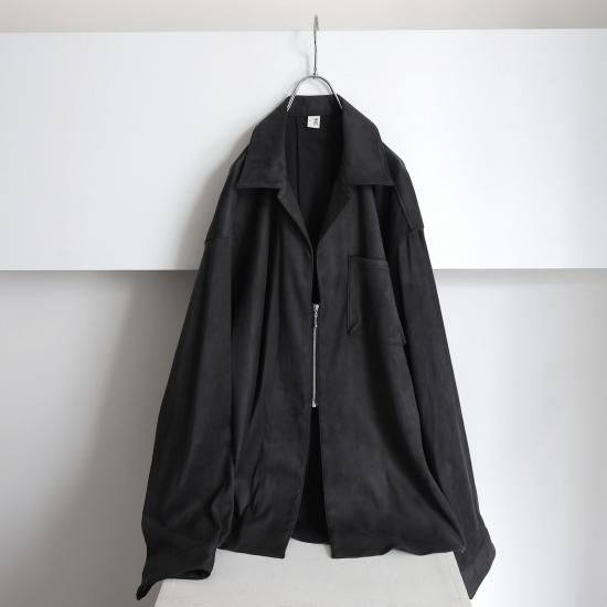 フロント深めのオープンカラー、ジップ仕様が特徴的なフェイクスエードジップシャツ