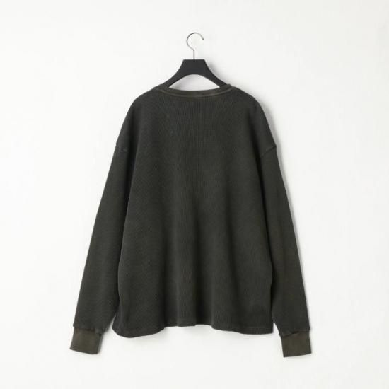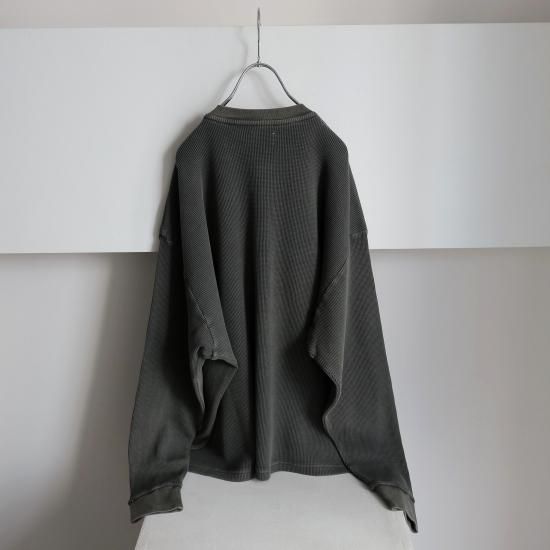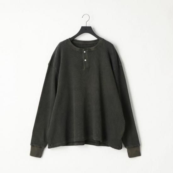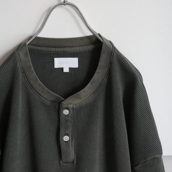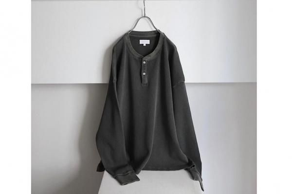 生地染めをした上にピグメントダイを施し、着古したようなムードに仕上げた1着・ガーメントダイヘンリーネックワッフル