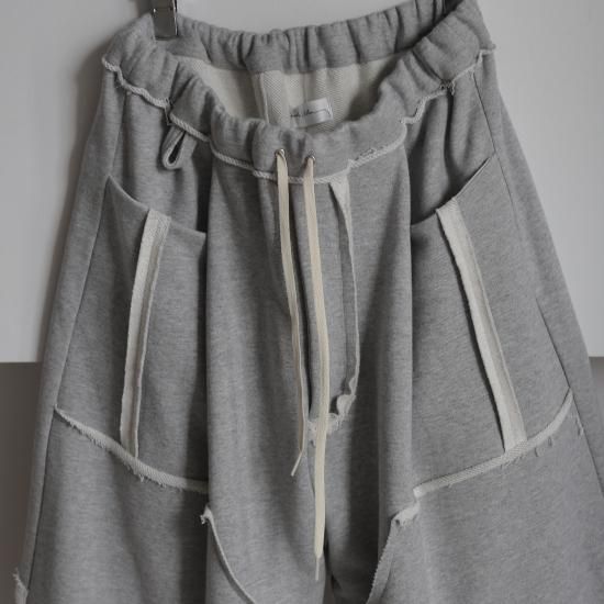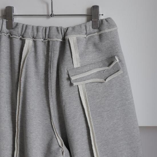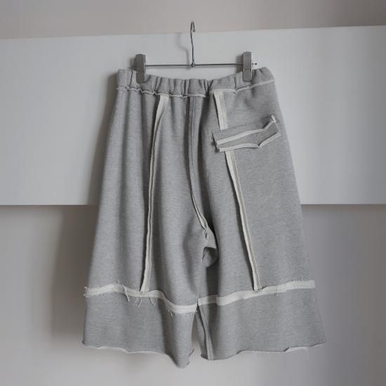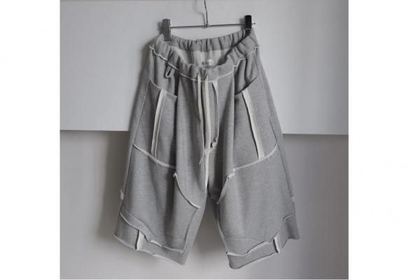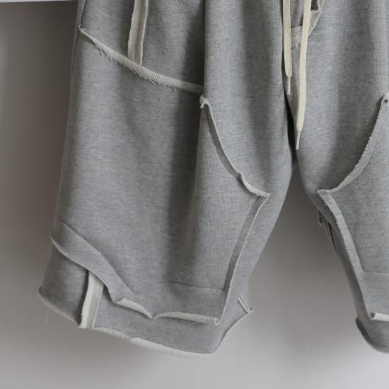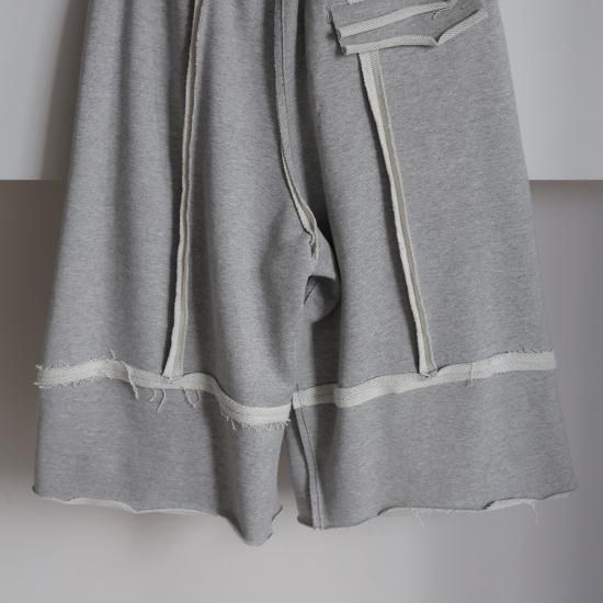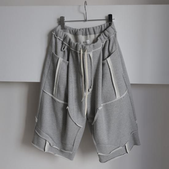 ダブルニーパンツをデザインベースにインサイドアウト、フロントタック、カットオフ等のディテールで立体感を出したスウェット素材のショートパンツ