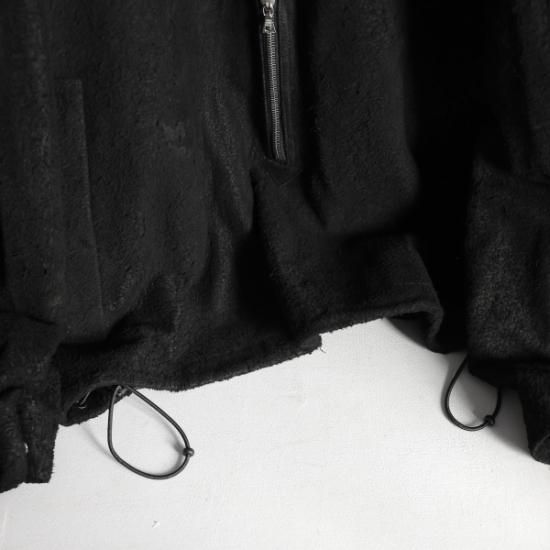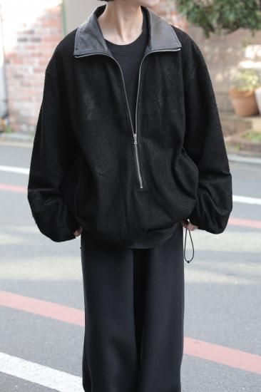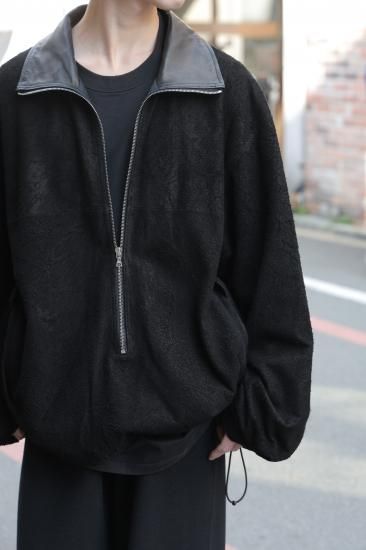 やや深めのフロントファスナー、レザーのムードが特徴のハーフジッププルオーバー
